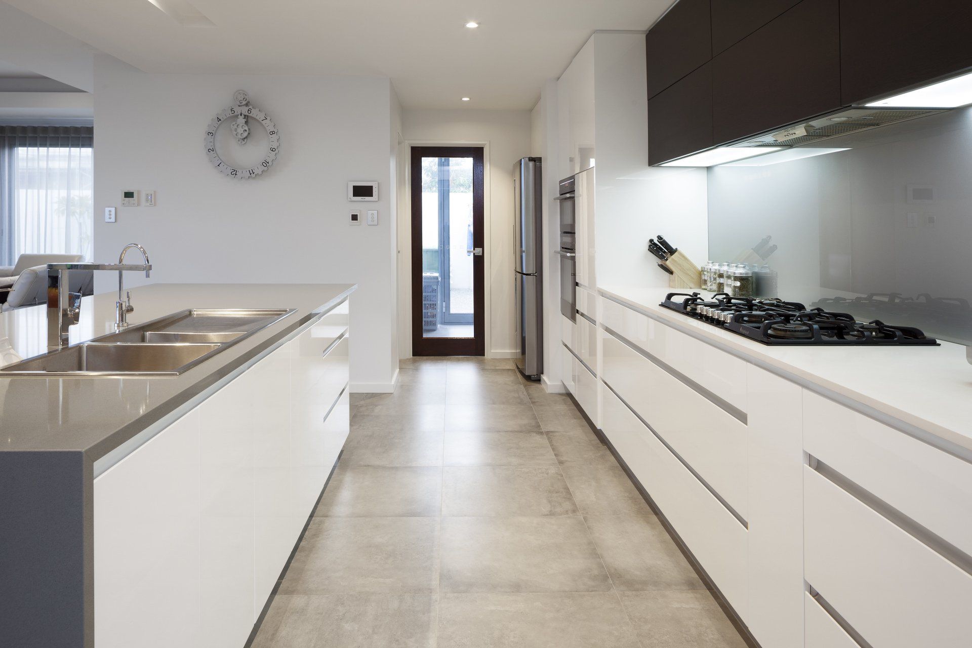 Located in a modern suburb, the clients chose to build with a New York industrial style in mind. The house had concrete floors and ceilings so the kitchen palette was chosen to compliment these with an industrial style in mind, framed with black cabinets and top scribes, glass door overheads with marble look benchtops and exposed brick. This combination created a visually interesting kitchen with a combination of lots of different textures adding more depth.